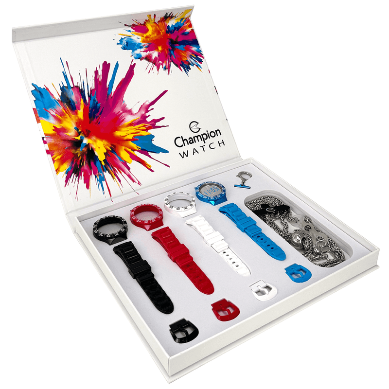 Champion Troca Pulseiras Digital vem com uma caixa metálica de 42mm e 4 pulseiras de plástico em cores incríveis, para você variar e combinar com qualquer look e ocasião.