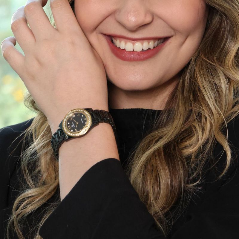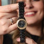 Um jogo de sedução visual que equilibra a luz e a sombra. Este modelo cativa pelo contraste dramático entre a caixa redonda em Dourado e a profundidade absoluta da cerâmica preta na pulseira e no mostrador. A caixa de 28 mm mantém uma dimensão clássica e delicada, perfeita para não sobrecarregar o pulso, enquanto o acabamento premium dos materiais eleva a peça a um estatuto de joia. É a escolha ideal para a mulher que deseja transmitir uma elegância enigmática e poderosa, seja numa reunião de negócios ou num jantar especial.